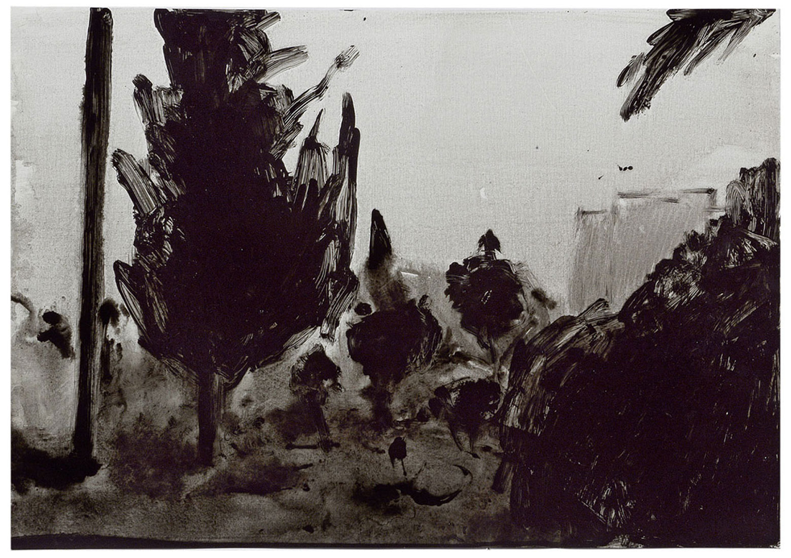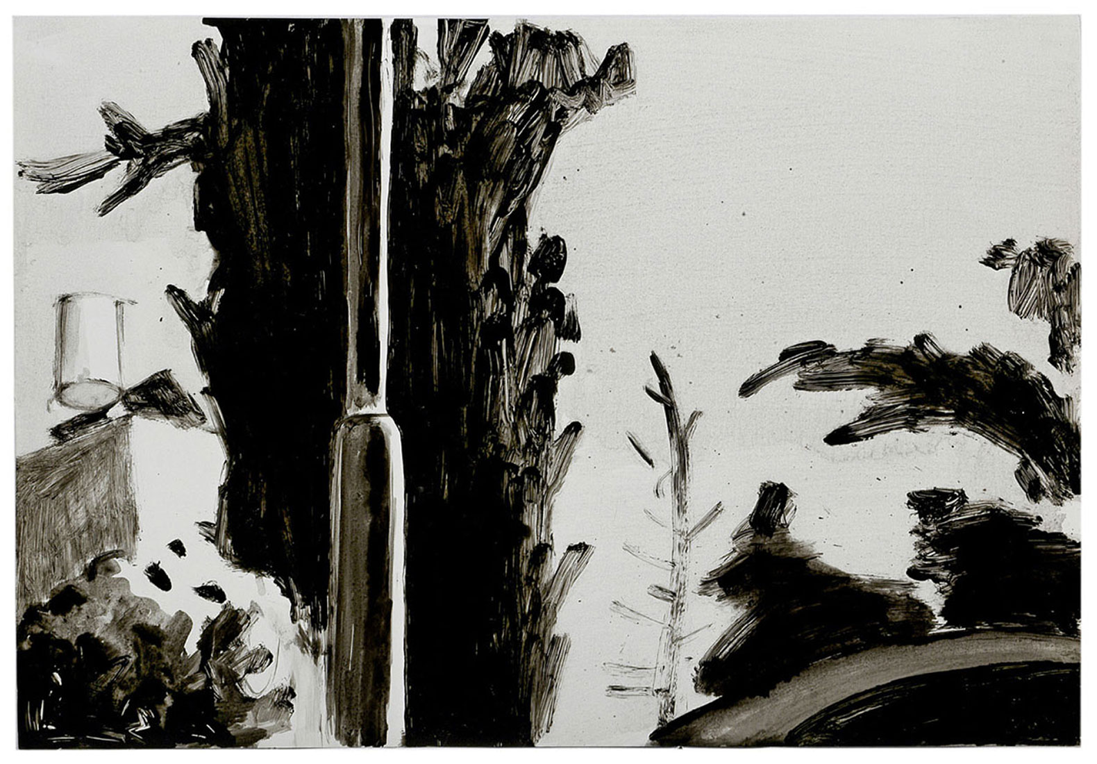 The apex of the exhibition is the series of drawings, some of which were exhibited last month at the Artists House. The drawings portray too the same derelict views. However, is seems they contain and exhaust the gamut of painting solutions offered in the other series. The means of drawing are supposedly more limited than the means of painting, yet this limitation entails a liberating element, a liberation expresses by Zaidel’s unique brushwork.Thus are reveled the movements of the hand holding the brush, which vary from short and tight movements to long and relaxed ones; between a hard and somewhat clumsy touch and the serene action of a sure hand. Tensions that previously were camouflaged under the cover of the painting are now exposed and rise to the surface. They charge the drawings with an intensive rhythm; at times, Zaidel tames the brush while at other times the brush overcomes him; sometimes he leads the brush along the path he paved, while other times the brush is set loose like a demon, dragging him along an unexpected frantic obstacle course.